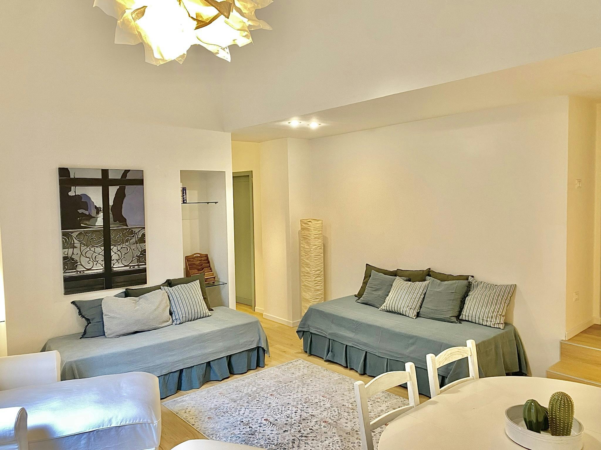 The entrance, which features a convenient wardrobe area, leads into the living area, where the window overlooks the greenery of the courtyard. In the living room, besides two comfortable armchairs, there is a sofa bed (which can be transformed into two single beds if needed) and a dining area. Wi-Fi and digital TV are available.