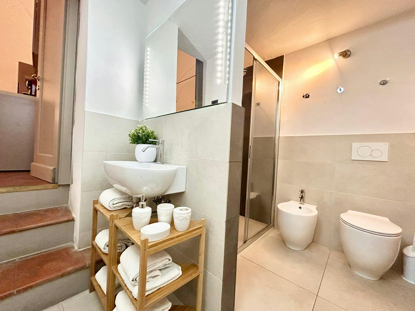 From the living area, you access the modernly renovated bathroom by going down three steps.