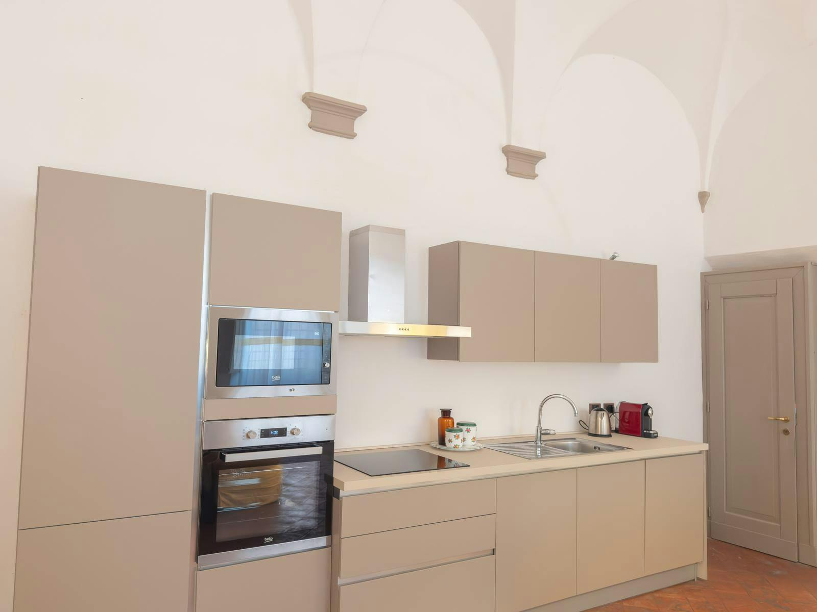 The kitchenette consists of a modern kitchen with an induction cooktop, fully equipped with all necessary appliances.